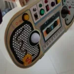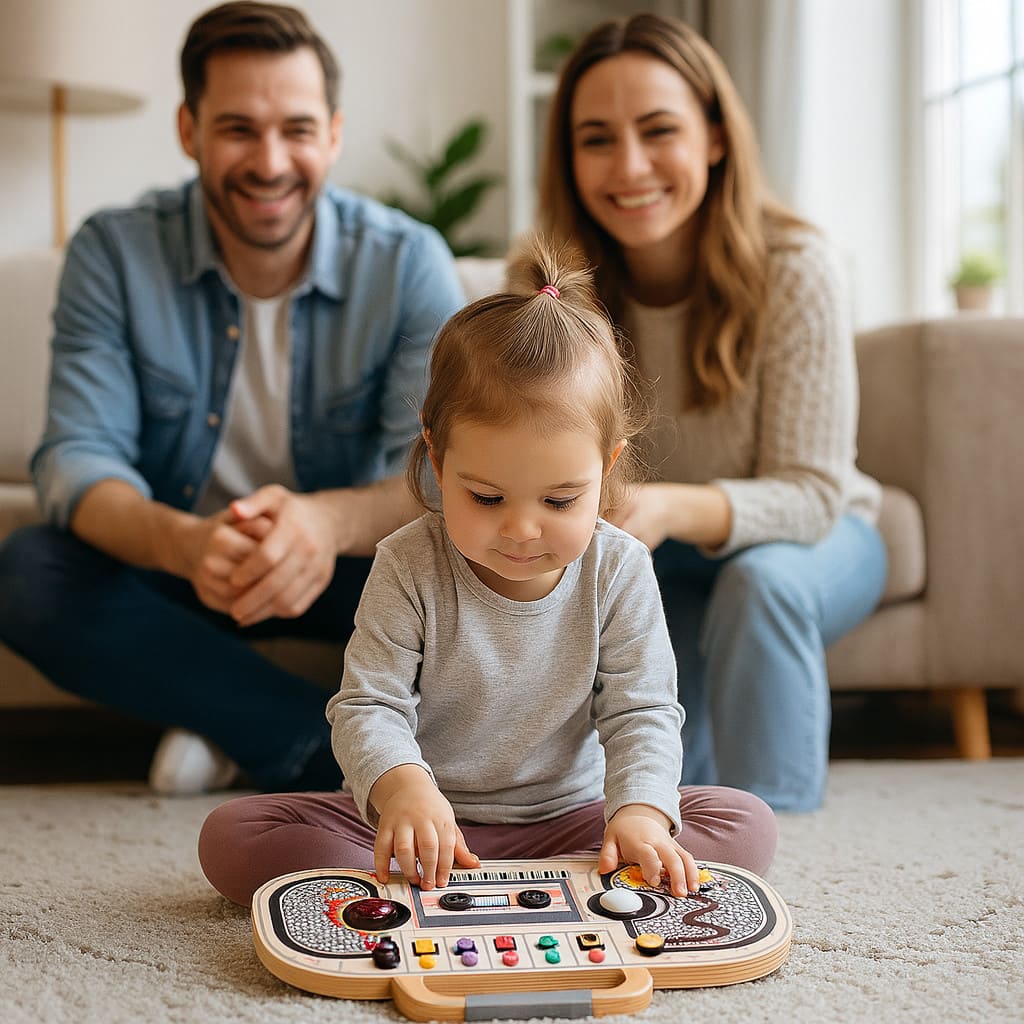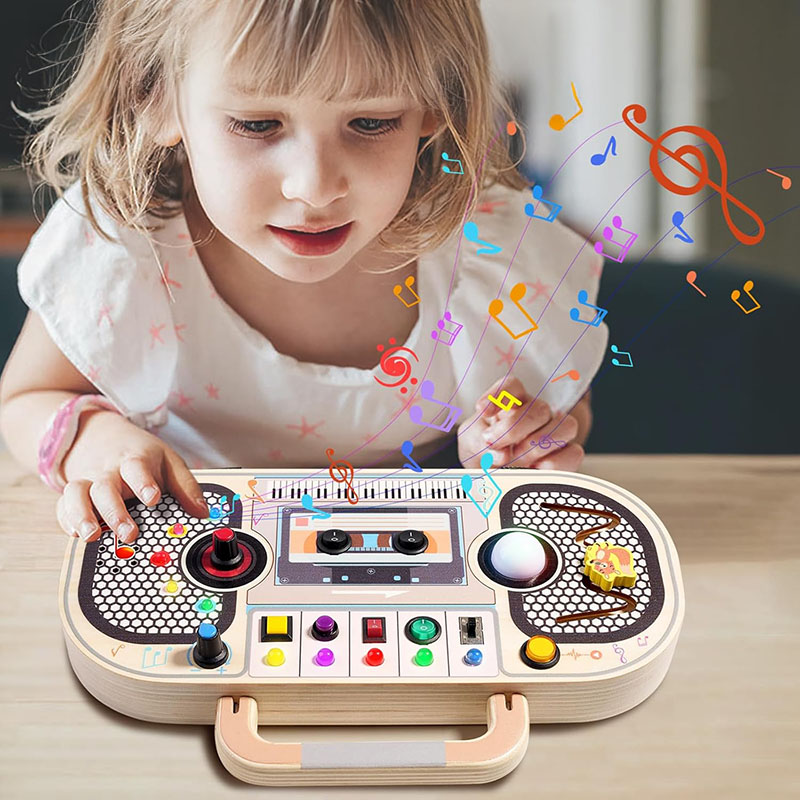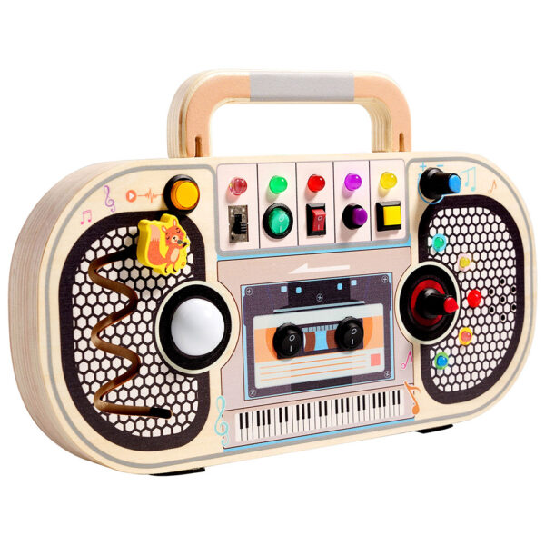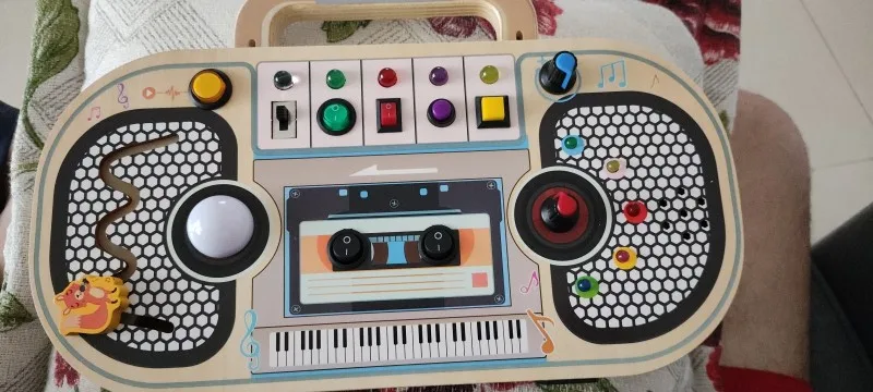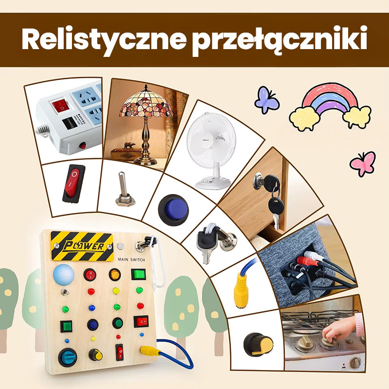 Drewniana tablica wyposażona jest w przełączniki inspirowane prawdziwymi domowymi urządzeniami, co sprawia, że zabawa staje się jeszcze bardziej angażująca i edukacyjna.