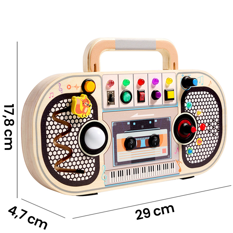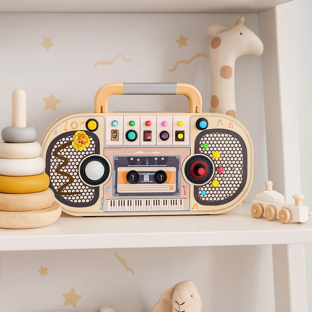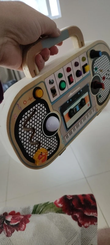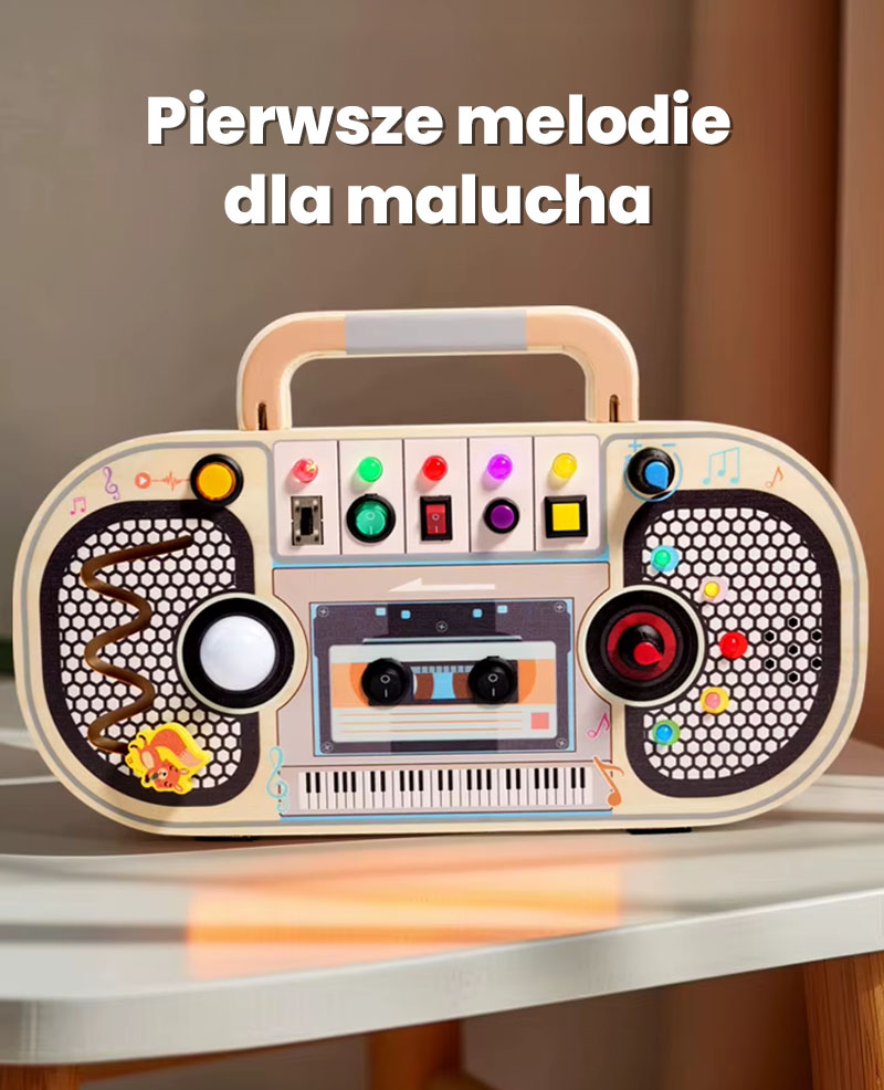 Ten kolorowy magnetofon z drewna to edukacyjna zabawka, która łączy muzykę, światło i naukę przez zabawę. Dzięki prostym przyciskom i przyjaznemu designowi rozwija zmysły i koordynację dziecka.
