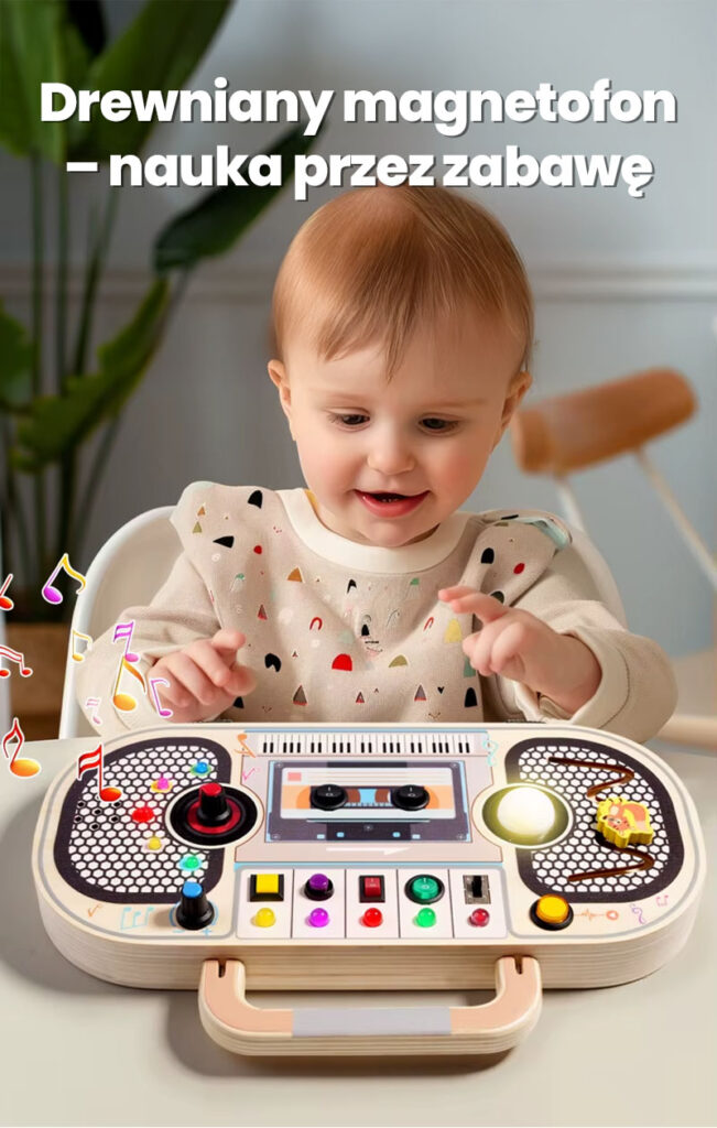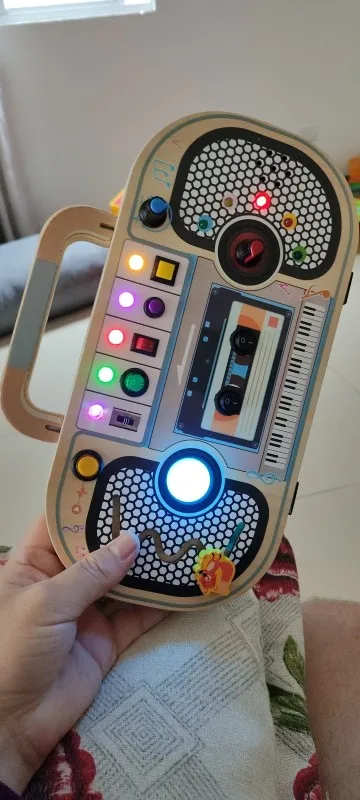 Ten drewniany magnetofon dla dzieci to idealna propozycja dla maluchów, które lubią muzykę, kolory i interaktywną zabawę. Został zaprojektowany tak, by rozwijać koordynację, zmysł słuchu i ciekawość świata poprzez dźwięk i światło.