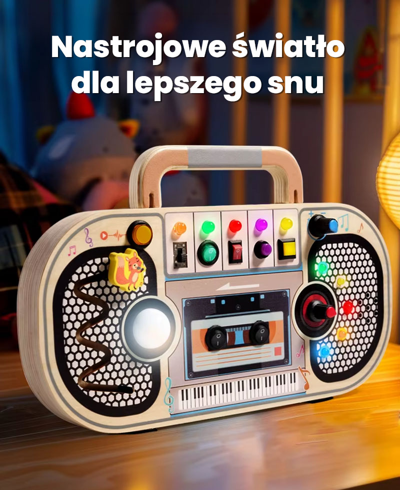 Ten drewniany magnetofon z LED tworzy przyjemny nastrój w pokoju dziecka, pomagając mu się zrelaksować przed snem.
