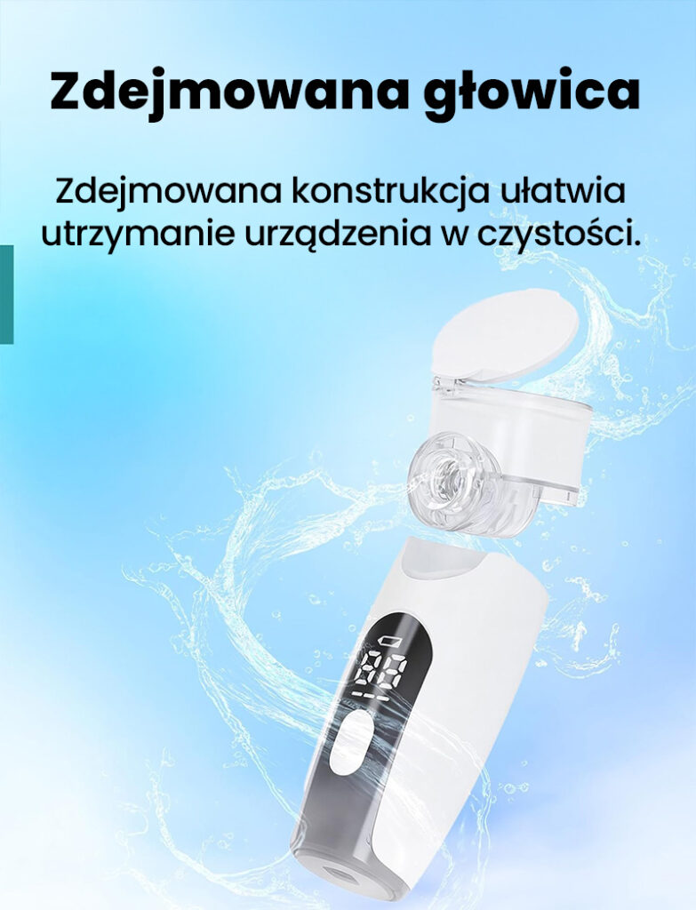 Zdejmowana głowica umożliwia szybkie mycie i dezynfekcję po każdej inhalacji.