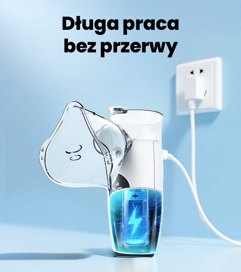 Nebulizator oferuje podwójny system zasilania, dzięki czemu możesz korzystać z niego w domu, w pracy czy w podróży — bez ograniczeń.