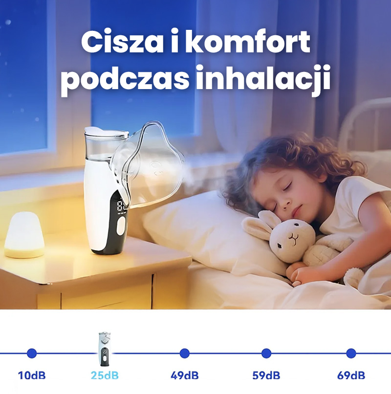 Poziom hałasu tylko 25 dB – cichszy niż szept, idealny do nocnych inhalacji.