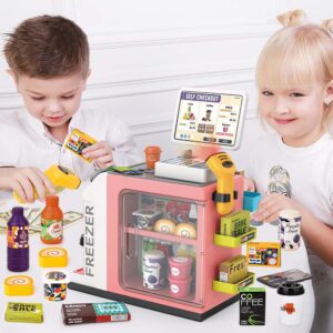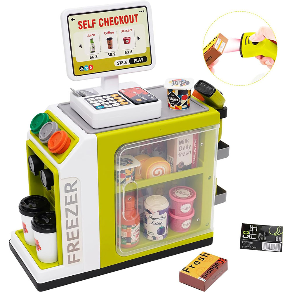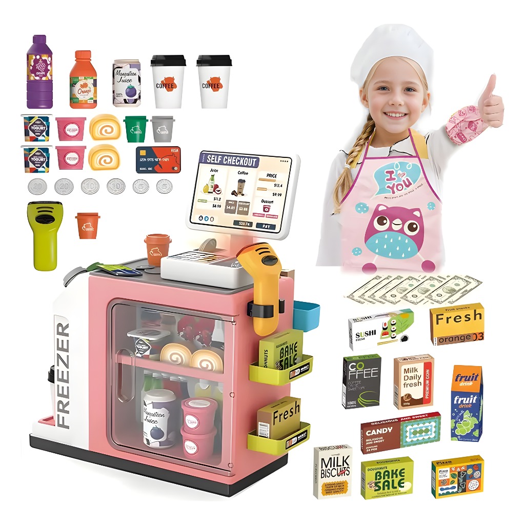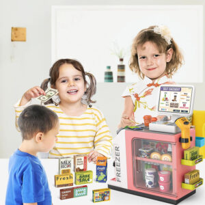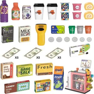 Ta zabawkowa kasa to nie tylko stanowisko kasowe – to mini-sklep w formie kompaktowej stacji. Dziecko może zmieniać sposób zabawy w zależności od nastroju: raz prowadzić supermarket, innym razem kawiarnię, a nawet sprzedawać chłodzone produkty z „lodówki”.