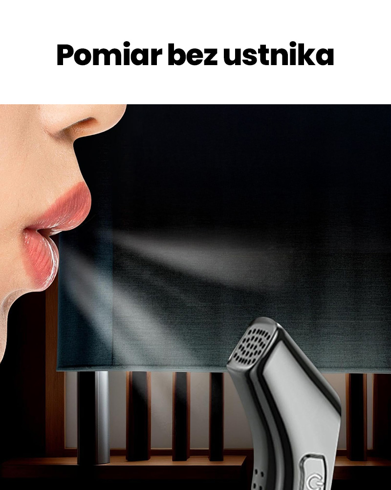 Urządzenie umożliwia wykonanie testu bez użycia ustnika, zapewniając higieniczne i komfortowe sprawdzanie poziomu alkoholu. Bezdotykowe działanie eliminuje konieczność kontaktu z ustami, ograniczając ryzyko przenoszenia zanieczyszczeń między użytkownikami.