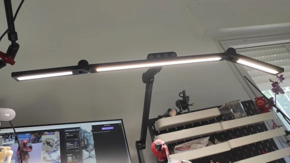 Dzięki dwóm niezależnym ramionom lampa pozwala precyzyjnie oświetlić zarówno przestrzeń roboczą na środku, jak i strefy po bokach – bez powstawania cieni czy prześwietleń. To idealne rozwiązanie dla osób pracujących na dwóch monitorach lub przy szerokim biurku.